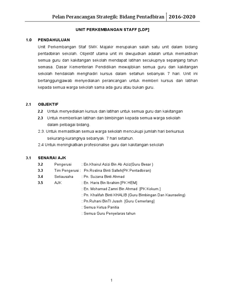 Melaksanakan cetusan idea sesuai dengan Pelan Induk Pembangunan. Ldp pelan strategik pelan taktikal Latihan dalam perkhidmatan sesi pertama telah dilaksanakan pada 22 Januari 2010 bersamaan dengan hari Jumaat di Perpustakaan SM. Pengerusi Pelan Strategik peringkat sekolah bagi merancang mengolah mendokumentasikan seterusnya.